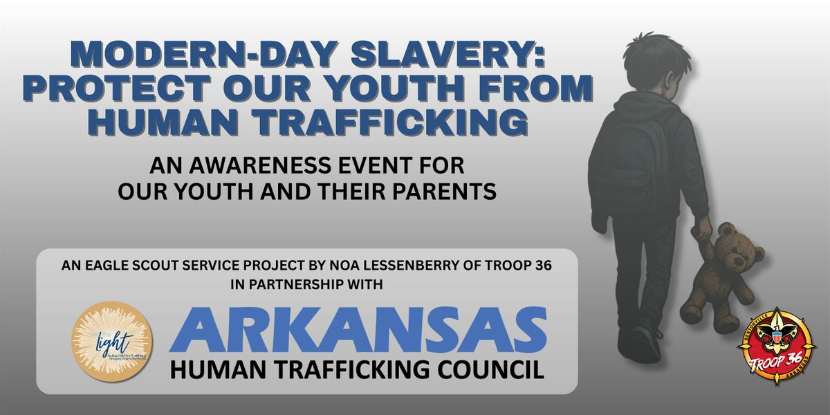Guest speakers include Sgt. Matt Foster of the Arkansas State Police and Arkansas Human Trafficking Council, Mark Ives of the Diocese of Little Rock Task Force Against Human Trafficking and Pornography, and representatives from the Benton County Sheriff's Office and the nonprofit organization Into the Light. This FREE event is a part of Noa’s Eagle Scout Service Project that includes collecting hygiene products for the victims of human trafficking and domestic abuse. Don't miss out on a chance to discover ways to protect our younger generation from this unnecessary evil. If you cannot attend the event but would like to support this project, you can donate here: https://intothelightus.kindful.com/. Choose SCOUTPROJECT:BACKPACKSOFHOPE as the campaign. Thank you in advance for your support!