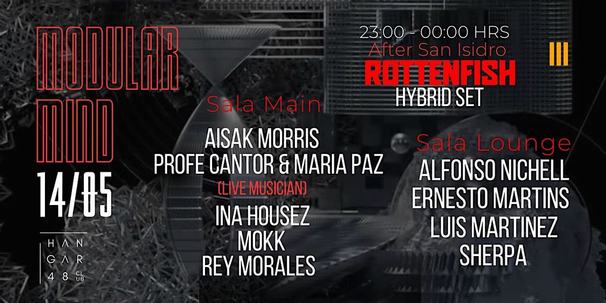 ¡Vive Modular Mind en Hangar 48! Este 14/05, electrónica pura con músicos en vivo, sets híbridos y con banda: Rottenfish. ¡Un San Isidro!