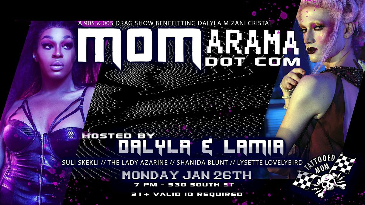 Burgeoning from the twisted mind of Slayher's Lamia The Cursed Queen and the warm bosom of Dalyla's Domain comes the third ever Mom Dot Com crossover episode! This month Lamia and Dalyla team up to show the children how it's done. Presenting fresh talent from Philly's up and coming drag scene, Suli Skekli, The Lady Azarine, Shanida Blunt, Lysette Lovelybird and more are poised to dazzle in their fiercest fashion. Performing hit songs from the new millenium, D & L are going back to basics to bring the backroom runway to the bombdotcom era of the 90s and 00s.
