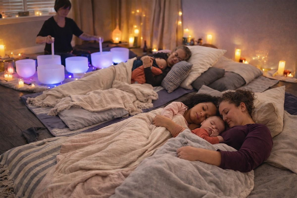 From there, you’ll rest together through 30–40 minutes of restorative sound healing with crystal singing bowls, chimes, and other soothing instruments. Intuitive Reiki is offered throughout the sound bath, supporting relaxation, regulation, and emotional ease for both mother and child.