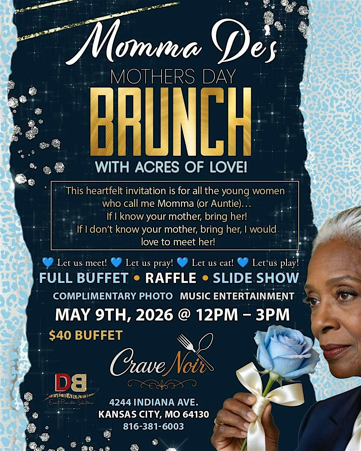 Get ready for a heartwarming Mother's Day Brunch you won't forget! Join us in person to celebrate all the amazing moms with delicious food, good vibes, and plenty of love. Whether you're bringing your mom, grandma, or a special mother figure, this is the spot to make memories and share smiles. Come hungry and leave happy with Momma De's special touch. Let’s make this Mother’s Day truly special together!