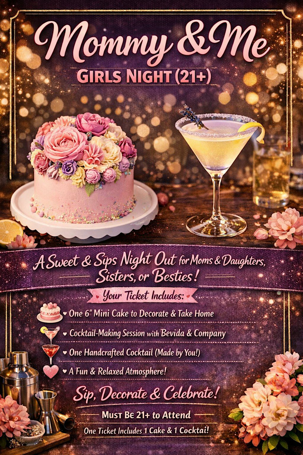 Moms deserve a night out, and we’ve got the perfect combo of sweets and sips! Join us for an indulgent evening where you’ll decorate your own mini cake and shake up a signature cocktail with step-by-step guidance. Whether you’re bringing your mom, daughter, sister, or bestie—this is a “Mommy & Me” date made for grown-ups only.