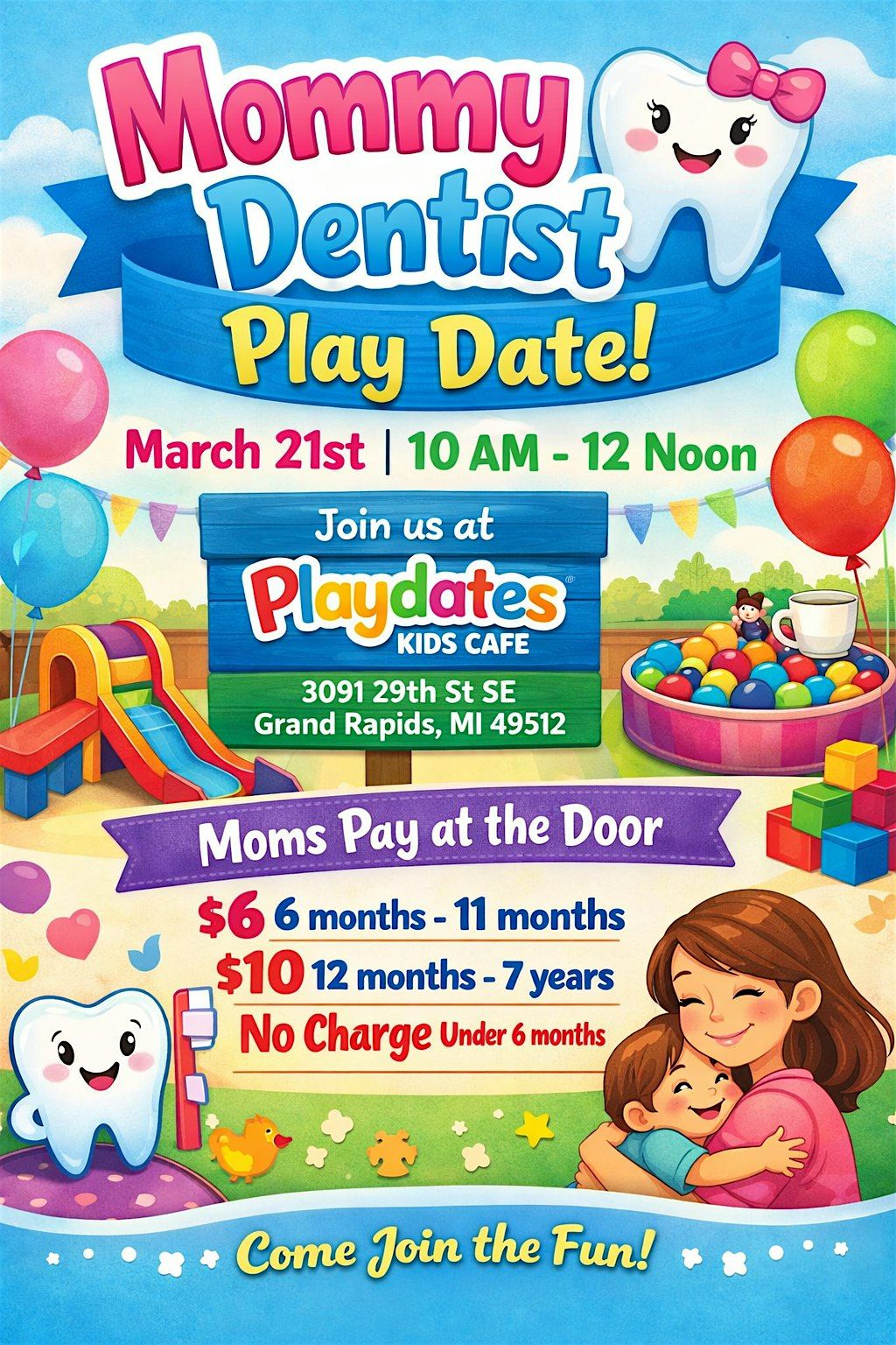 Mommy Dentist Play Date! March 21, 10–12 at Playdates Kids Cafe in GR. Connect, sip coffee & let the kids play. Pay at door!