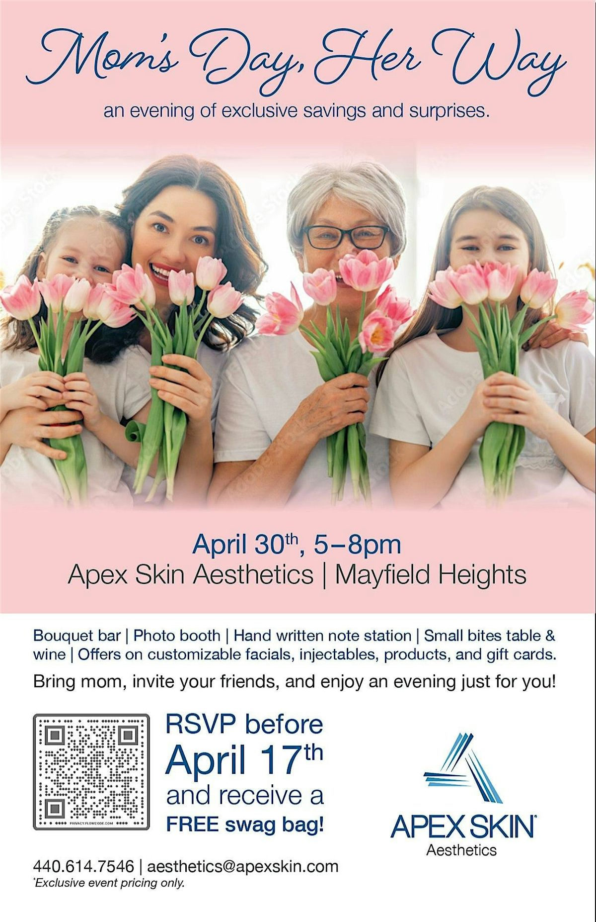 Celebrate Mother’s Day with us for an evening of beauty, relaxation, and thoughtful touches. Create your own bouquet at our bouquet bar, snap memories in our photo booth, and write a heartfelt note to someone special. Enjoy light bites and beverages while indulging in exclusive savings on custom facials, injectables, skincare products, and gift cards. RSVP by April 17th and receive a FREE swag bag at the event!