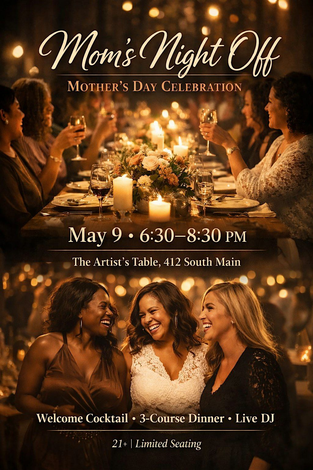 Mom’s Night Off is an intimate dinner experience designed for mothers to relax, celebrate, and enjoy a night out before the busy Mother’s Day celebrations begin.
