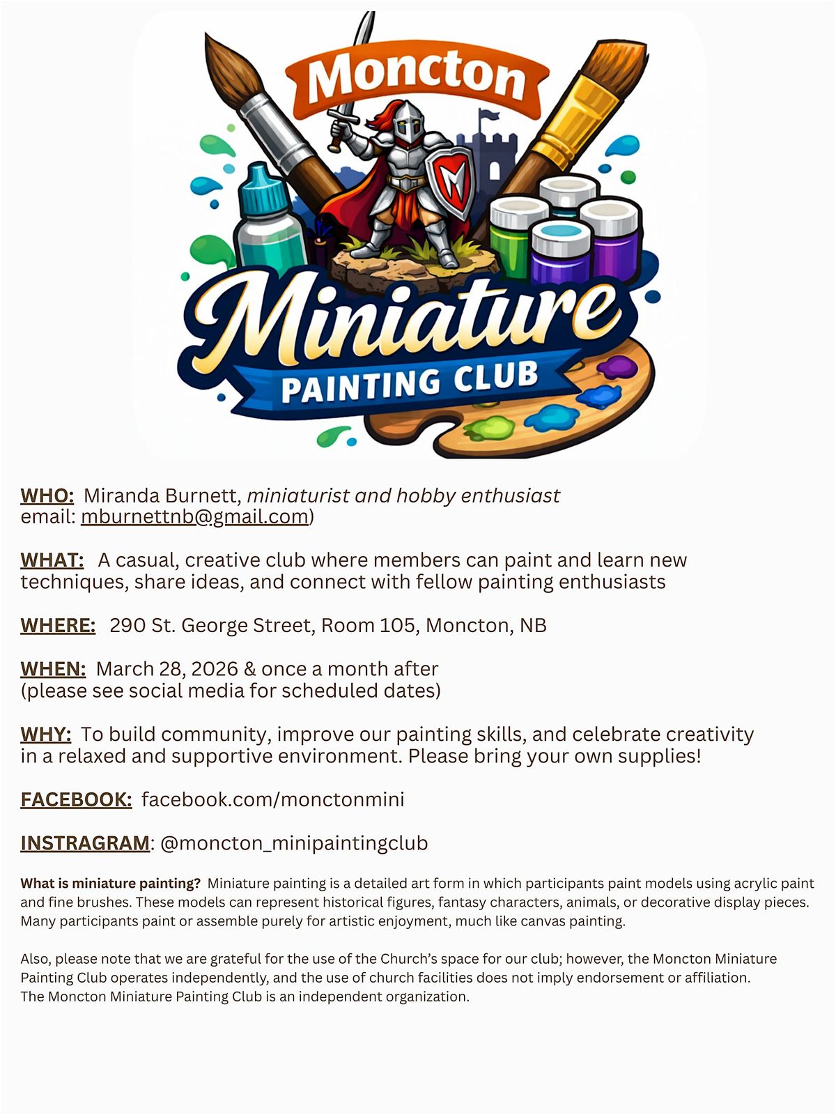 Hey there! Love miniatures? Join the Moncton Miniature Painting Club/Club de Peinture de Miniatures de Moncton for some in-person fun. Whether you're a pro or just starting out, it's a chill spot to share tips, paint cool figures, and meet fellow hobbyists. Bring your supplies and passion—let's make tiny art together!