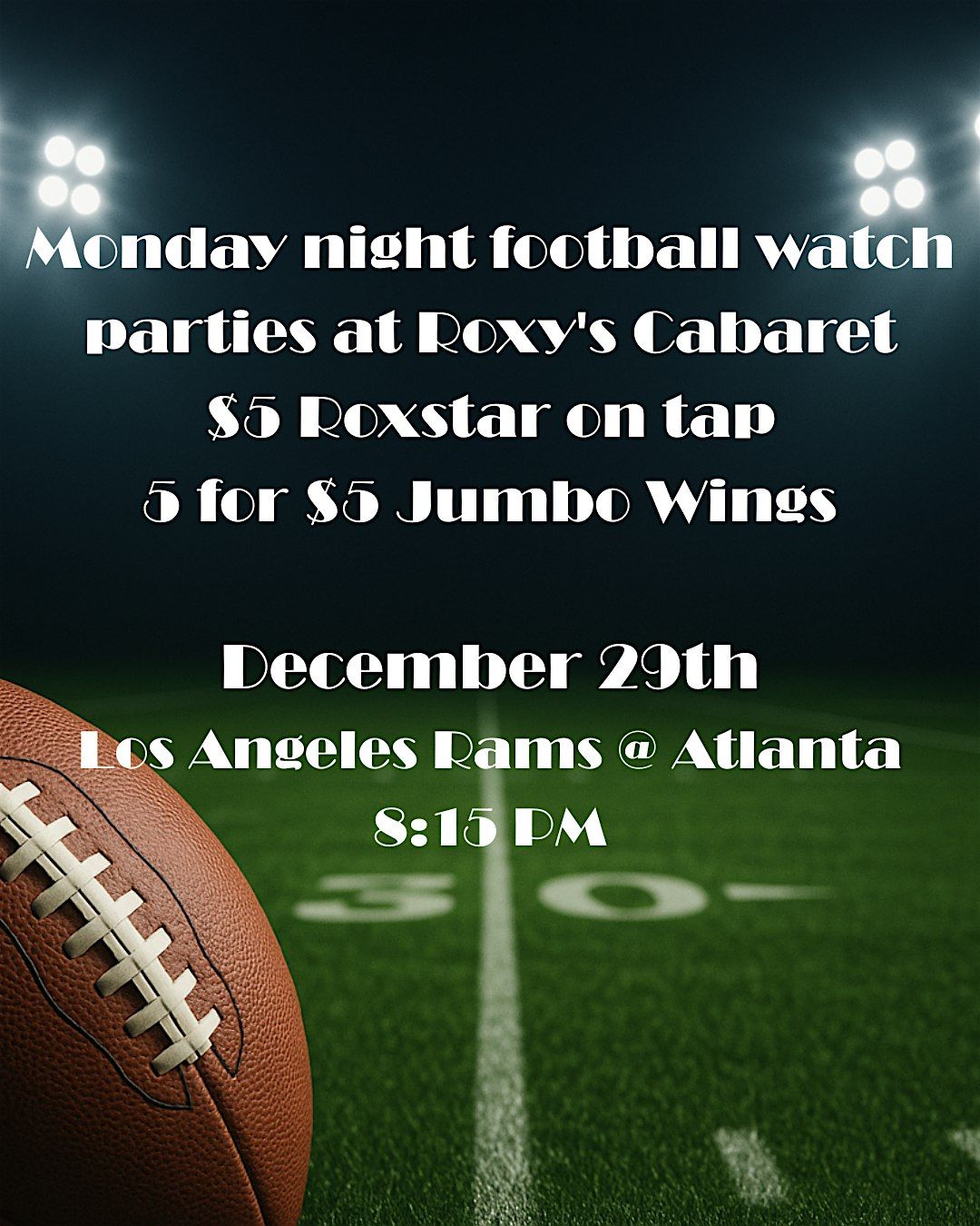Join us Monday night as Roxy’s Cabaret transforms into your go-to game-day destination! Catch all the Monday Night Football action on the big screens in our lively, cabaret-meets-sports-bar atmosphere — where the energy is high, the drinks are cold, and the food hits just right.