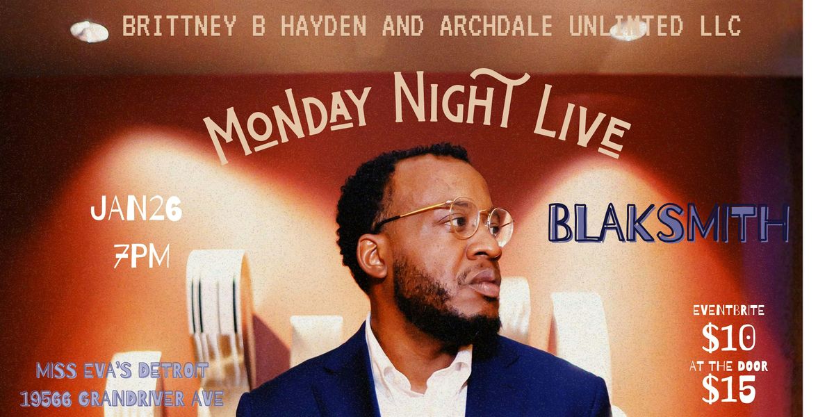 BLAKSMITH takes Monday Night Live with Brittney B Hayden & band. Live music, great food, open mic sign-ups—early arrival suggested.