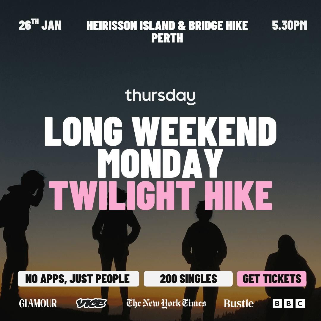 🌅 Thursday Dating Presents: Hike, Flirt & Flow with a Twilight Hike - Perth x The Hike CollectiveConnection looks better offline.We’re taking it back to basics - real people, real conversations, and golden hour views of glorious Perth. Join us for a guided hike through Heirisson Island & The Matagarup Bridge on Monday 26th January (Public Holiday), designed to spark fresh connections in a setting that’s low-key, fun, and pressure-free.
