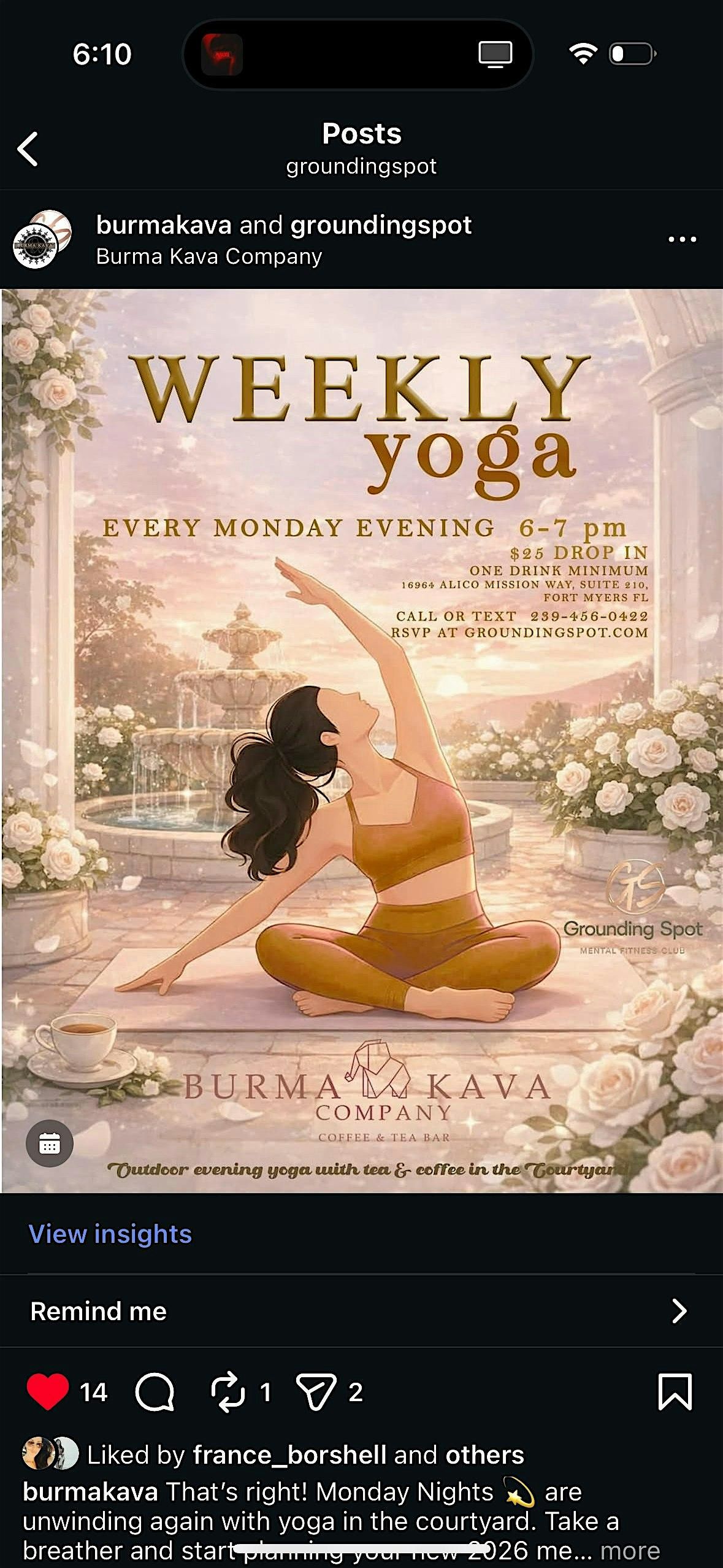 Come move, breathe, and unwind with Grounding Spot Mobile Wellness—where wellness meets community every Monday evening.