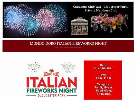 Gloucester Park Will Come Alive For The Mondo Doro Italian Fireworks Night On Friday 19th November.Join The Caduceus Club Private Members Club @ Gloucester Park And Enjoy The Best View Of Harness Racing In Luxurious Comfort And A Spectacular Fireworks Display After The Last Race.