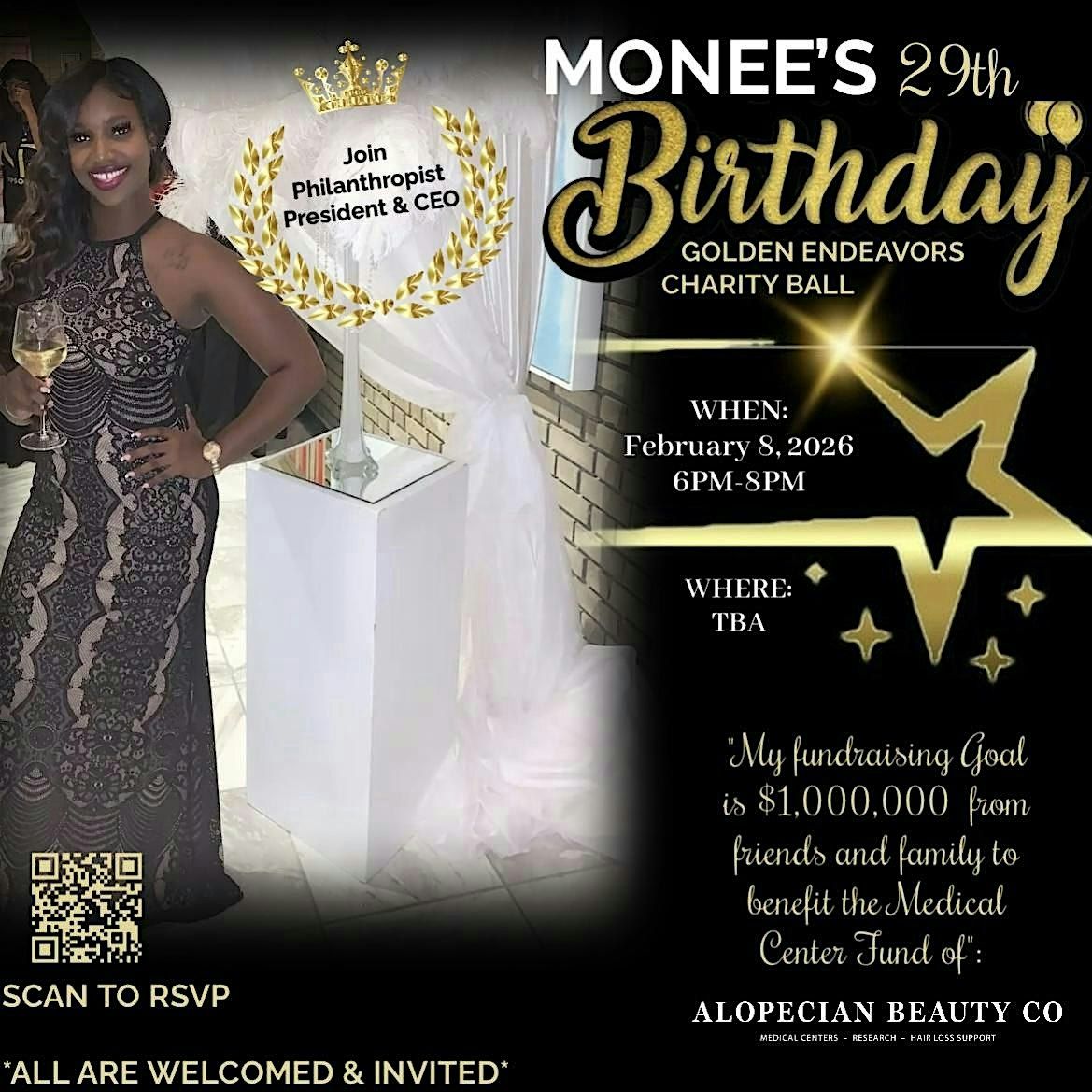 You are cordially invited to an extraordinary evening celebrating purpose, elegance, and generosity—Moneé Sanders’ 29th Birthday Month: The Golden Endeavors Charity Ball.