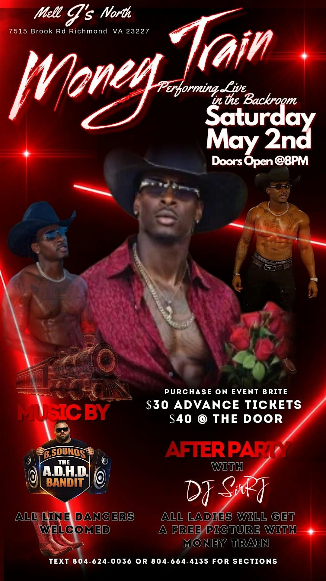 Ladies!!!! Come see Money Train performing live at Mel J's North in the Backroom from 8 PM to Midnight! All ladies will get a free picture with Money Train. Music by B-Sounds, the ADHD Bandit! At midnight DJ Sir RJ will take over the 1s and 2s to get the After Party turned up. Advanced tickets are $30 here on EventBrite, $40 at the door from 8-midnight, then $50 after midnight. Get your tickets early!