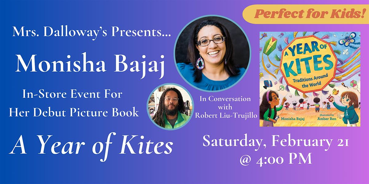 Join us at Mrs. Dalloway's Bookstore on Saturday, February 21 at 4:00 PM when San Francisco Bay Area debut picture book author Monisha Bajaj comes to the store to share her new book A Year Of Kites: Traditions Around The World. Monisha will be joined in conversation by Robert Liu-Trujillo and will sign copies of her book after the presentation.