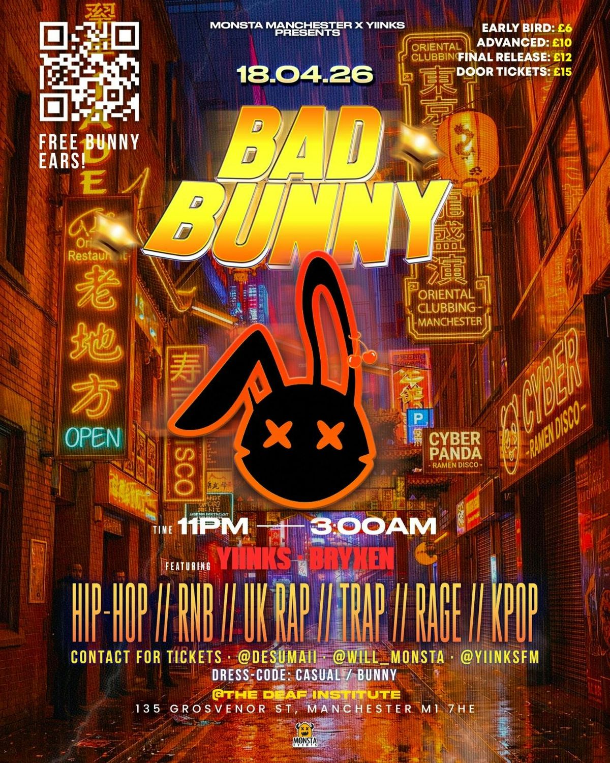 MONSTA MANCHESTER IS BACK THIS APRIL 🐰🔥Get ready for a BRAND NEW experience… introducing BAD BUNNY 😈🎶We’re bringing you the BEST of US Hip-Hop, RnB, Trap Rage, K-Pop & more all night long!📍 The Deaf Institute (Main Room)📅 Saturday 18th April 2026⏰ 11PM – 3AM (Last entry 1AM)🎧 DJ YIINKS x BRYXEN bringing the energy ALL NIGHT🐰 FREE bunny ears for girls👗 Dress code: Smart & Casual🧥 Cloakroom available🎂 FREE entry for April birthdays👯♀️ Best dressed group wins £25 — so come DRIPPED OUT🎟️ Tickets:Early Bird – £5Advanced – £10Final Release – £12On the Door – £15VIP – £[email protected]_@angeliccasket@[email protected]@[email protected]___@getsu_18@[email protected]@iloveelaii@desumaii⚠️ This one’s gonna be CRAZY… don’t wait aroundCop your tickets from your promoters ASAP 🎟️🔥Disclaimer: