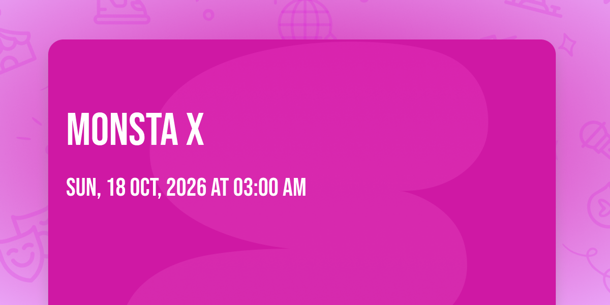 📍 Location: 33.4489, -112.079✨ Enter a world of endless possibilities at Monsta X, where every moment tells a story! 🏛️ The stunning Arizona Financial Theatre in vibrant Phoenix, AZ transforms into a realm of wonder on October 18th, 2026 at 03:00 AM. 🌟 They have crafted an experience that goes beyond the ordinary, combining elements of surprise, delight, and pure entertainment. Every detail has been thoughtfully considered to ensure your journey with us is nothing short of extraordinary. 🎯 Join fellow adventure seekers and memory makers in this celebration of imagination and innovation. 🎊 Reserve your spot today and be part of something truly special!