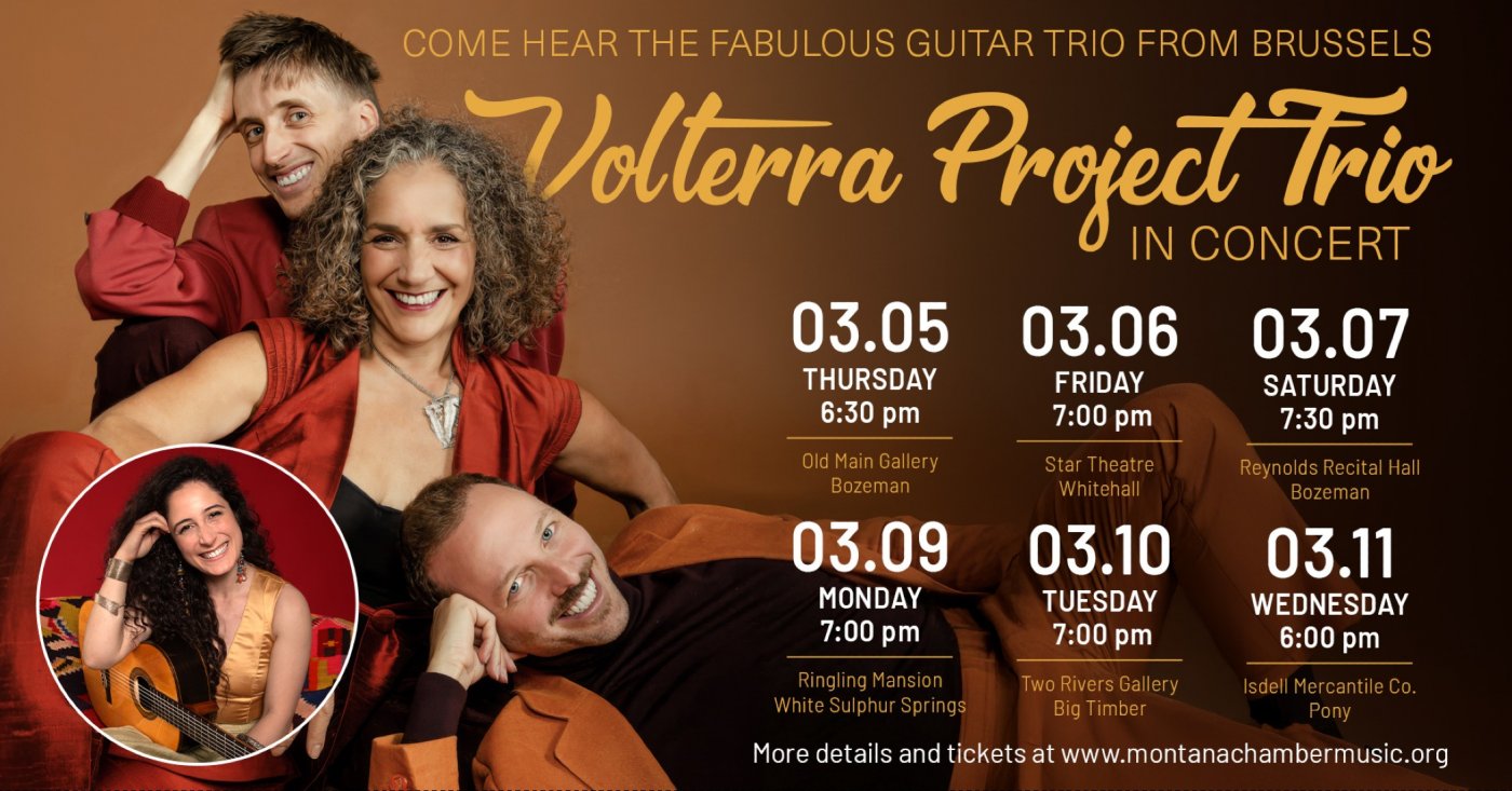Hailing from Brussels, the Volterra Project Trio reimagines classical guitar trio music, drawing inspiration from European impressionism, Mediterranean folk melodies and cinematic scores. Antigoni returns to the Montana Chamber Music stage with her guitar trio after her successful visit with the Ahn Trio in 2024.
