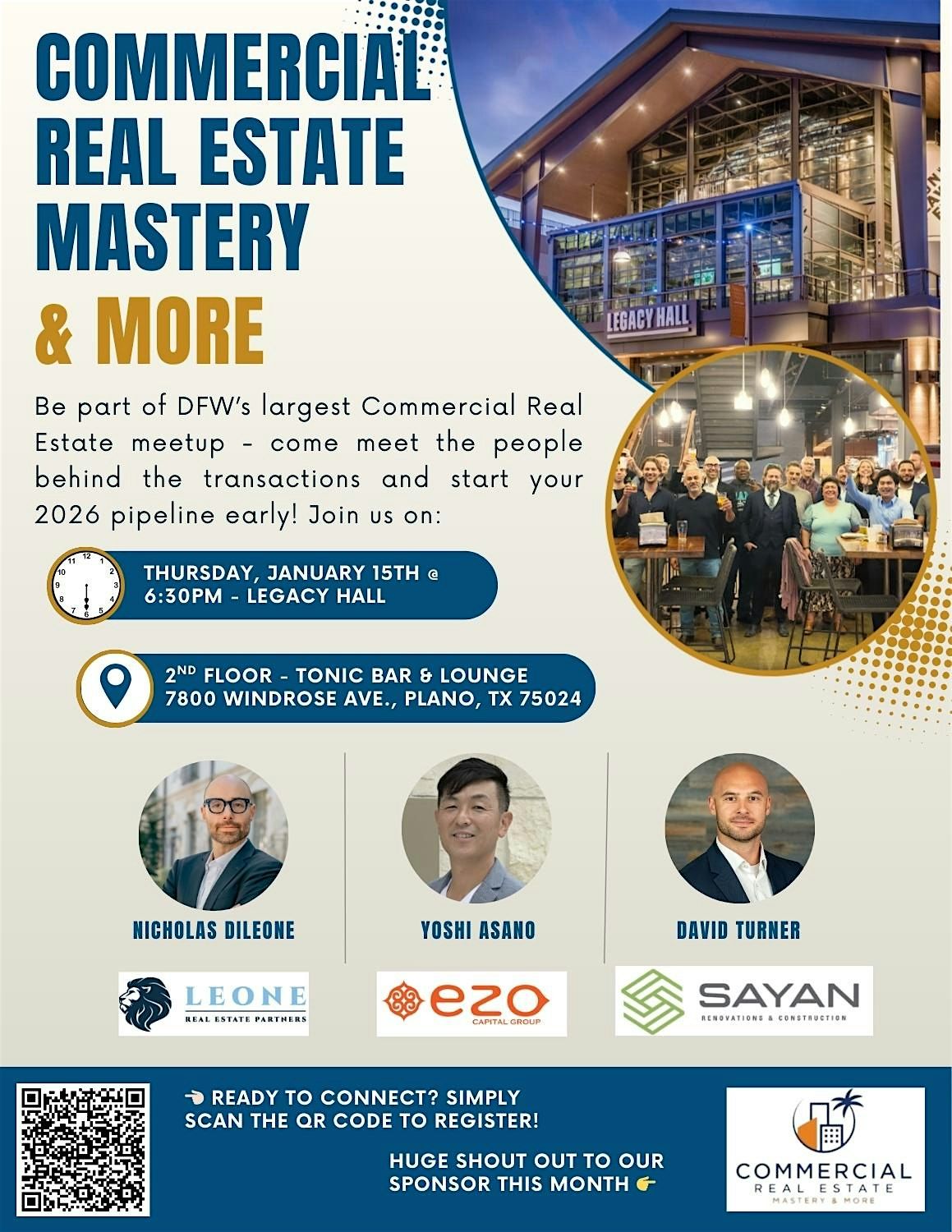 Your hosts Nick DiLeone, Yoshi Asano, and David Turner welcome you to DFW’s largest commercial real estate meetup at Legacy Hall at Legacy West (Plano).
