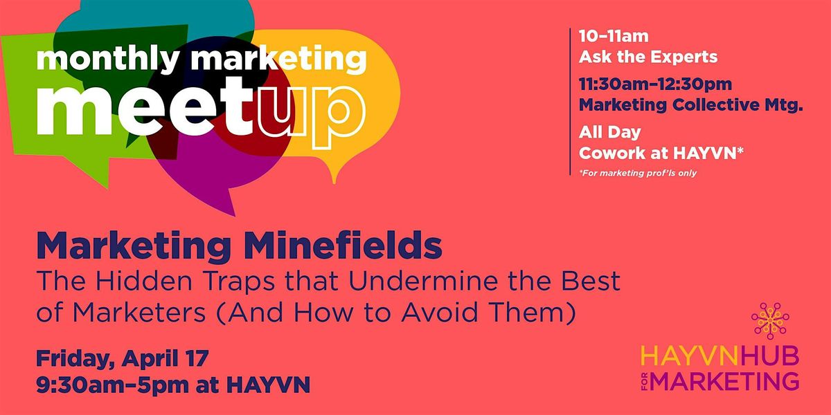 - 11:30am-12:30pm: Marketing Collective Monthly Meetup Overview: Marketing Minefields: The Hidden Traps That Undermine the Best of Marketers (And How to Avoid Them). (See more info below)