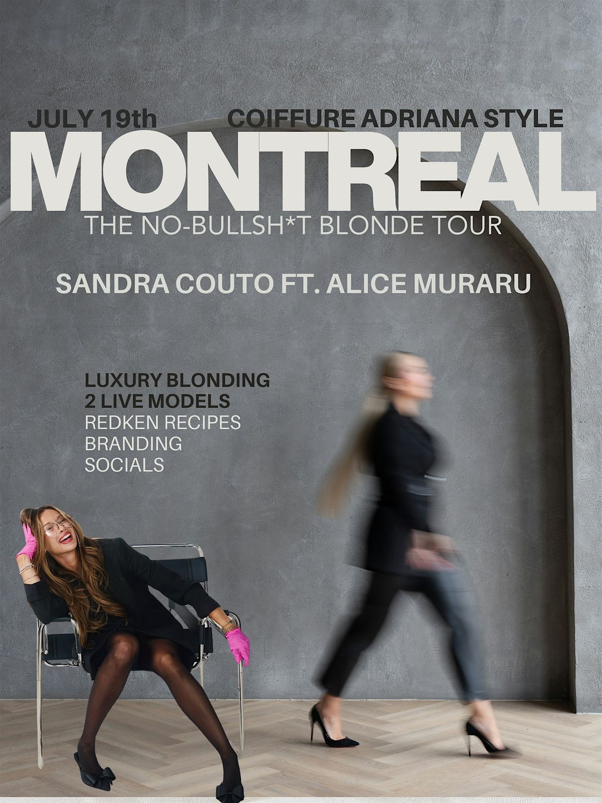 Welcome to the NO BULLSH*T BLONDE master class happening at Coiffure Adrianna Style , Montreal on July 19th 2026 at 9:30 AM (Eastern Time). Get ready to dive into the world of luxury blends and discover the art of creating and mapping scalp foils for the perfect blonde blends. Join us for a fun and interactive session where you'll learn the secrets behind blonding, RAW & UNFILTERED , no secrets just the truths behind how to create seamless blondes. Don't miss out on this amazing opportunity to elevate your BLONDE game! See you there!