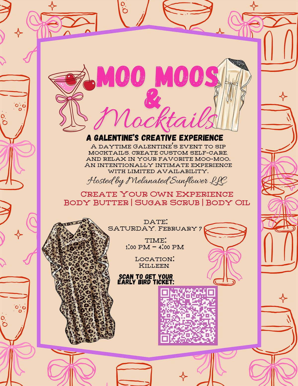 Moo Moos & Mocktails is a Galentine’s creative experience designed for women to gather, relax, and enjoy intentional self-care in a cozy, welcoming space. Guests will sip mocktails, enjoy light bites, create custom self-care essentials, design their own floral bouquet, and enjoy shopping throughout the event. The experience is intentionally relaxed and flexible, allowing guests to move at their own pace while connecting, creating, and celebrating Galentine’s in a meaningful way. Slip into your favorite moo-moo, bring your girlfriends, and enjoy an afternoon centered on creativity, softness, and connection.