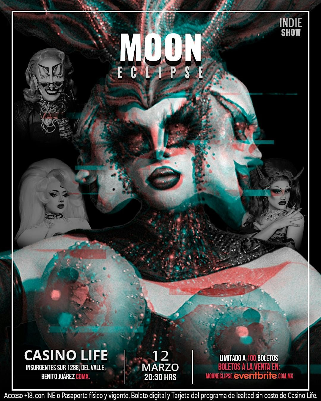 Disfruta de ''ECLIPSE´´´´" un espectáculo lleno de talento alternativo y oscuro a cargo de ''MOON'' y sus invitad´xs especiales: HIDDEN MISTAKE, LA MORRA LISA Y SANTA LUCIA. Con números iconicos que te dejarán con el ojo cuadrado.