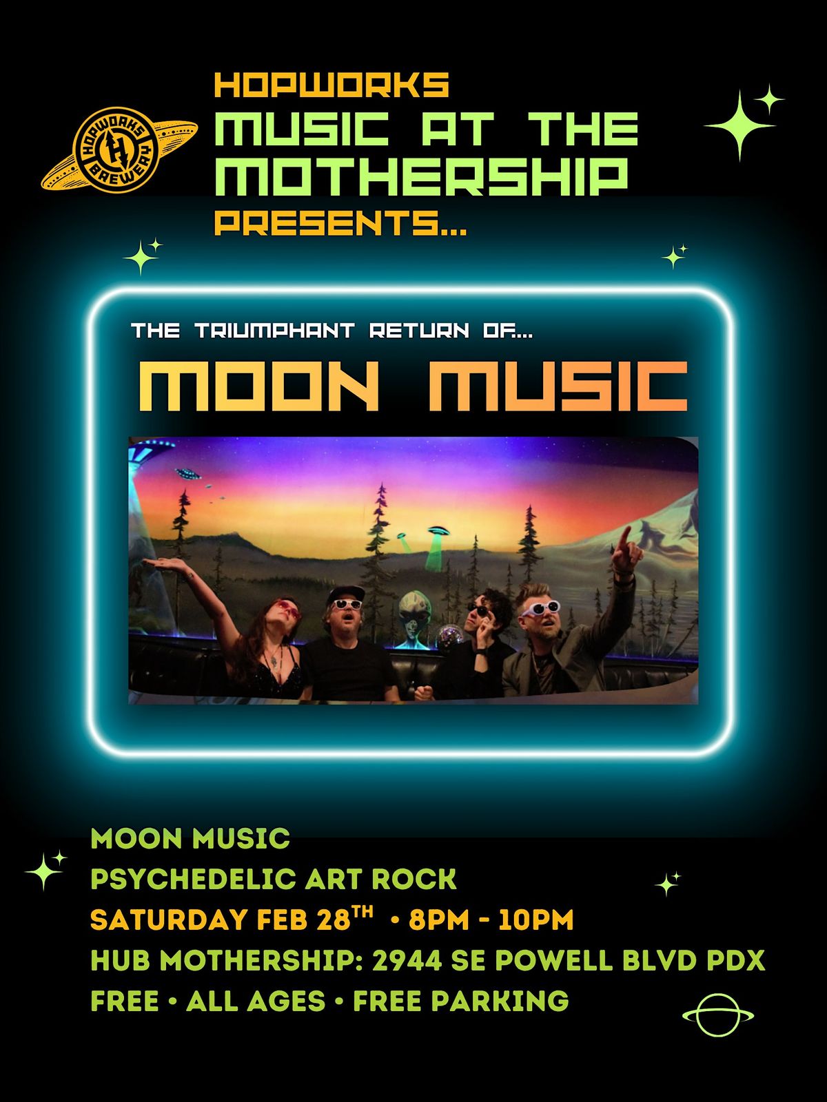 Moon Music is touching down at Hopworks Brewery! Get ready for a psychedelic art rock experience that will take you on a ride. Grab a pint, enjoy some delicious food, and hit the dance floor!