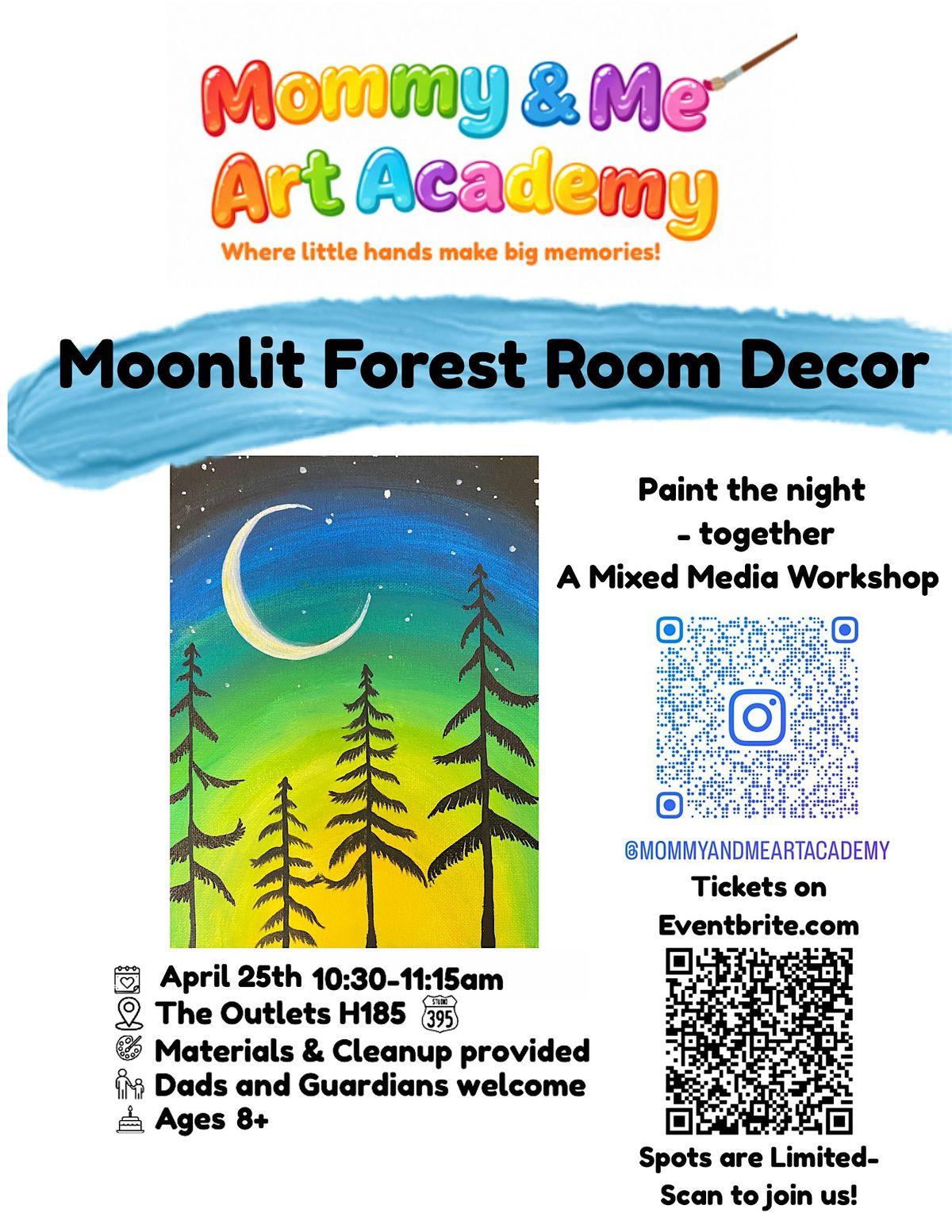 In this special Mommy & Me class, you and your child will explore texture, layering, and nighttime magic as you build a glowing forest scene inspired by twinkling skies and quiet woodland wonder. Using paint, layered materials, and hands-on techniques, we’ll bring the moonlight to life against a rich, dark background — creating a piece that feels both magical and meaningful.