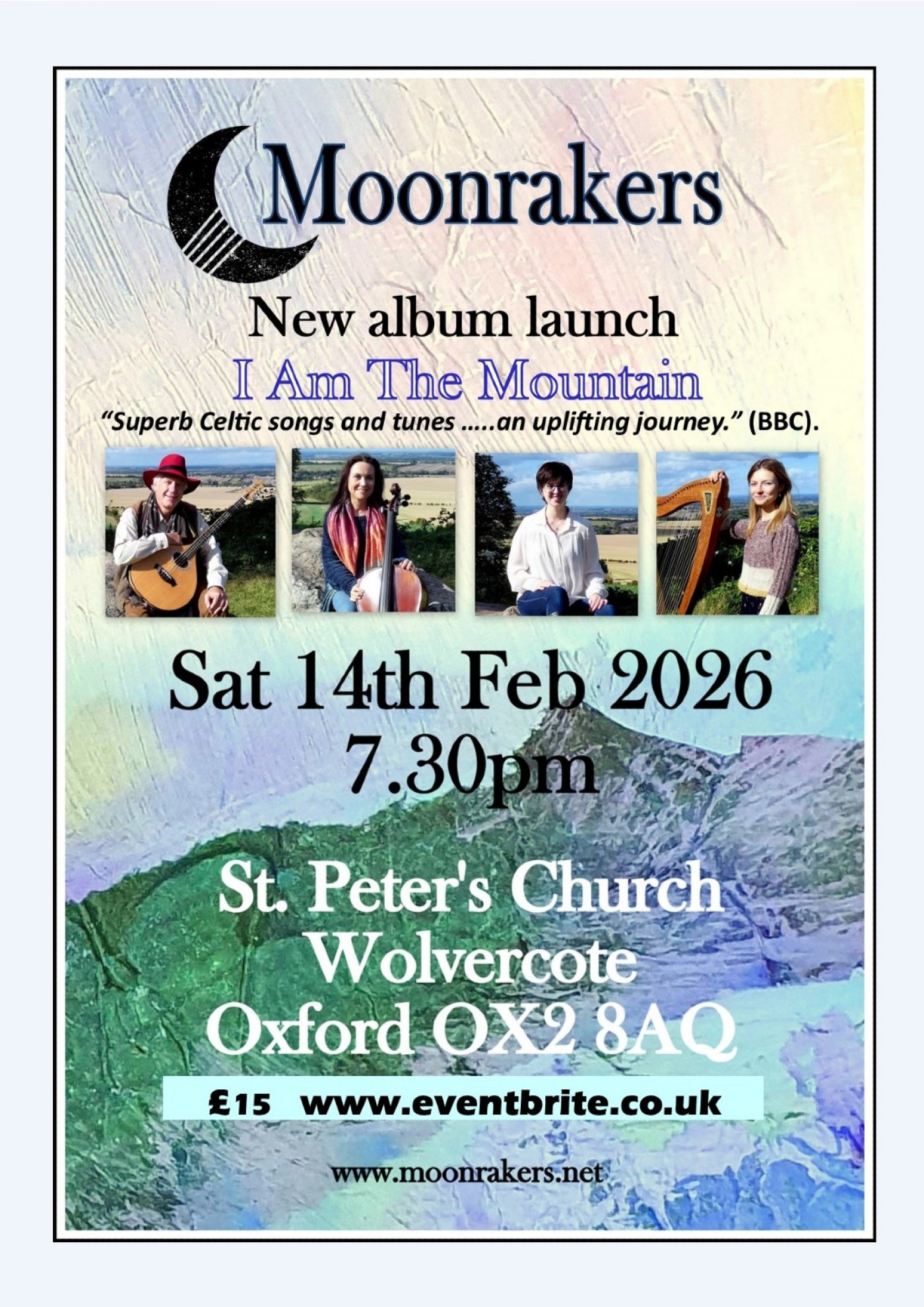 Acclaimed folk ensemble Moonrakers launch their new album titled 'I Am The Mountain' on February 14, 2026, at St Peter's Church, Oxford. The band, known for their rich soundscapes and story-songs, will perform a blend of traditional and contemporary music from across the UK and Ireland. The event promises to be a celebration of their musical journey, featuring new songs and tunes, and is a must-attend for folk music enthusiasts. Tickets are available for purchase, and the event is a great opportunity to experience the band's unique blend of instruments and vocals.