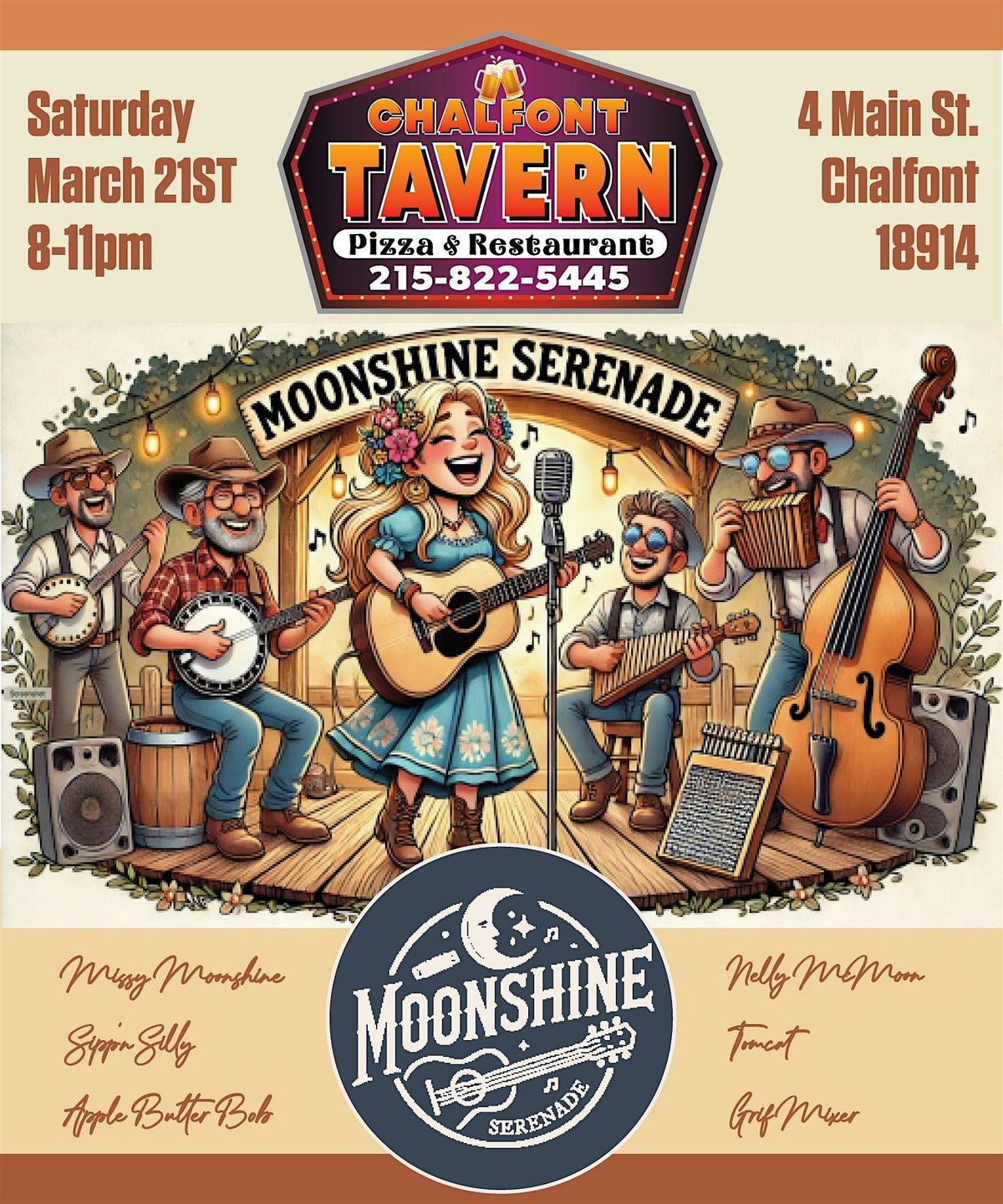 Moonshine Serenade this weekend at Chalfont Tavern. Live music, whiskey, and good times starting at 8pm.