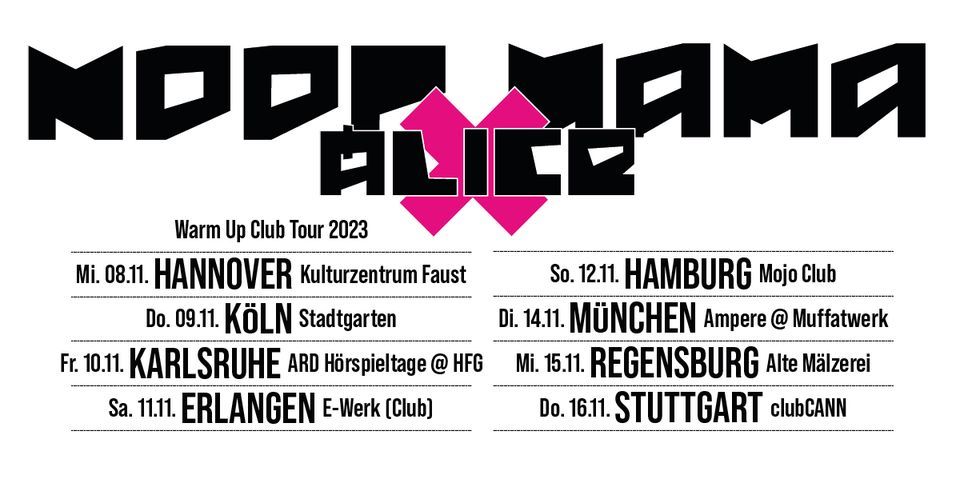 Anschnallen, die Reise beginnt diesen Herbst. Warm Up Club Tour heißt, die Band riechen, ganz nah dabei beim Neustart. Es geht um neue Songs, es geht um alte Songs, die Musik von Moop Mama. Es wird laut, wild und mitreißend! Exklusiv im Club, bevor es 2024 wieder auf die großen Bühnen geht.