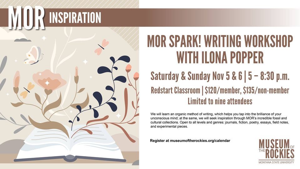 Spark fresh ideas in your writing! This workshop focuses on the moment you first put words on the page, creating something out of nothing. Structure and fresh language emerge from the earliest lines, and the raw, unpolished work becomes a blueprint for later revisions. You will learn to write, share, and gain valuable feedback. We will learn an organic method of writing, which helps you tap into the brilliance of your unconscious mind; at the same, we will seek inspiration through MOR’s incredible fossil and cultural collections.