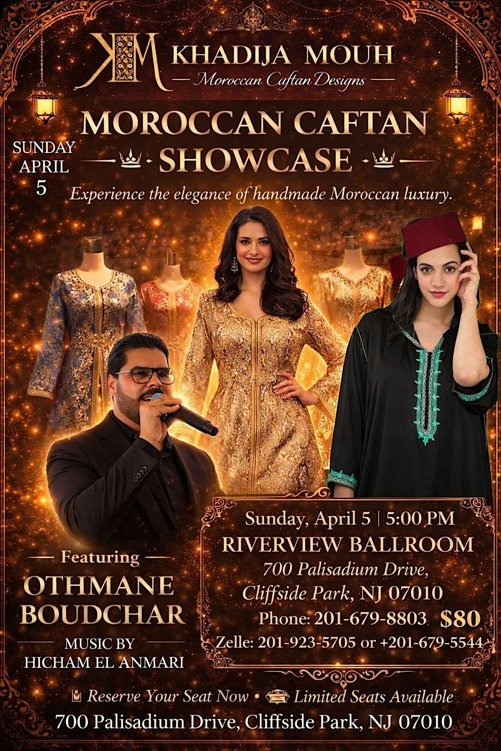 Eid Mubarak Said! The story behind this fashion show is to celebrate Eid and to celebrate the opening of my boutique. We are also celebrating Moroccan soccer. There will be a fashion show and dinner. Entertainment will be provided by a wonderful Moroccan singer Boudchart. He is one of two brothers who is doing special things for Moroccan music. Come and celebrate with me a night of fashion, Morocco and culture.