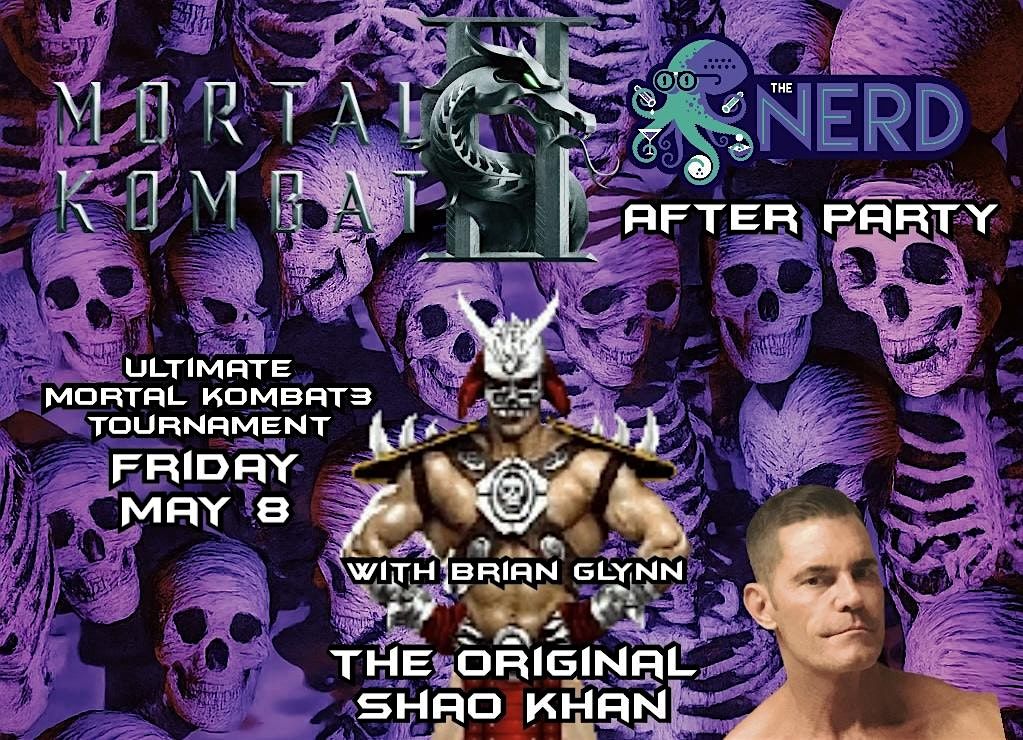 Friday May 8th after the film release of Mortal Kombat II join the after party with the original Shao Khan, Brian Glynn inside The Nerd. He will be signing autographs and telling players YOU SUCK as they get eliminated from the Ultimate Mortal Kombat 3 tournament. Tournament players can participate for free with entry. MK themed prizes to the winners.