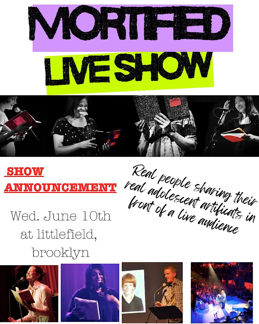 Since 2002, Mortified has been curating teen angst artifacts from people like you. The project began when founder David Nadelberg discovered an unsent love letter he wrote us as a teenager. The letter sparked an idea and he sent an email to friends asking if anyone wanted to share their childhood writings on stage. That email went viral and soon, responses poured in from strangers near and far. Over a decade later, what started with a single letter transformed into a movement that included a range of participants (ad execs, architects, stand-ups, salesmen, writers, receptionists, actors, and attorneys) excited to “share the shame” from LA to DC to Amsterdam. We encourage people everywhere– even those with no interest in appearing on stage– to unearth the strange stuff they created as kids and share them with at least one person. You’d be surprised what you discover in the process.