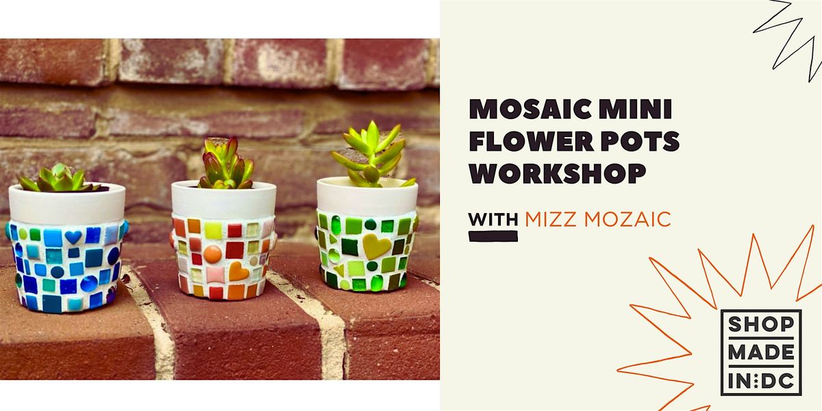 In this beginner workshop, you'll learn the art of mosaic making & how to repurpose broken plates into beautiful, functional art pieces. Mizz Mozaic will guide you through the process, from selecting & breaking plates and other pieces of mosiac tiles, to arranging them into beautiful designs. By the time you finish, you'll leave with 3 unique & personalized mini flower pots to add color, texture & creative flair to any outdoor space.
