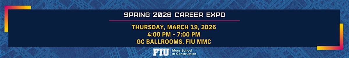 The Spring 2026 Career Expo will be held on Thursday, March 19, 2026 from 4:00pm – 7:00pm at the Graham Center (GC) Ballrooms, FIU Modesto A. Maidique Campus (MMC).