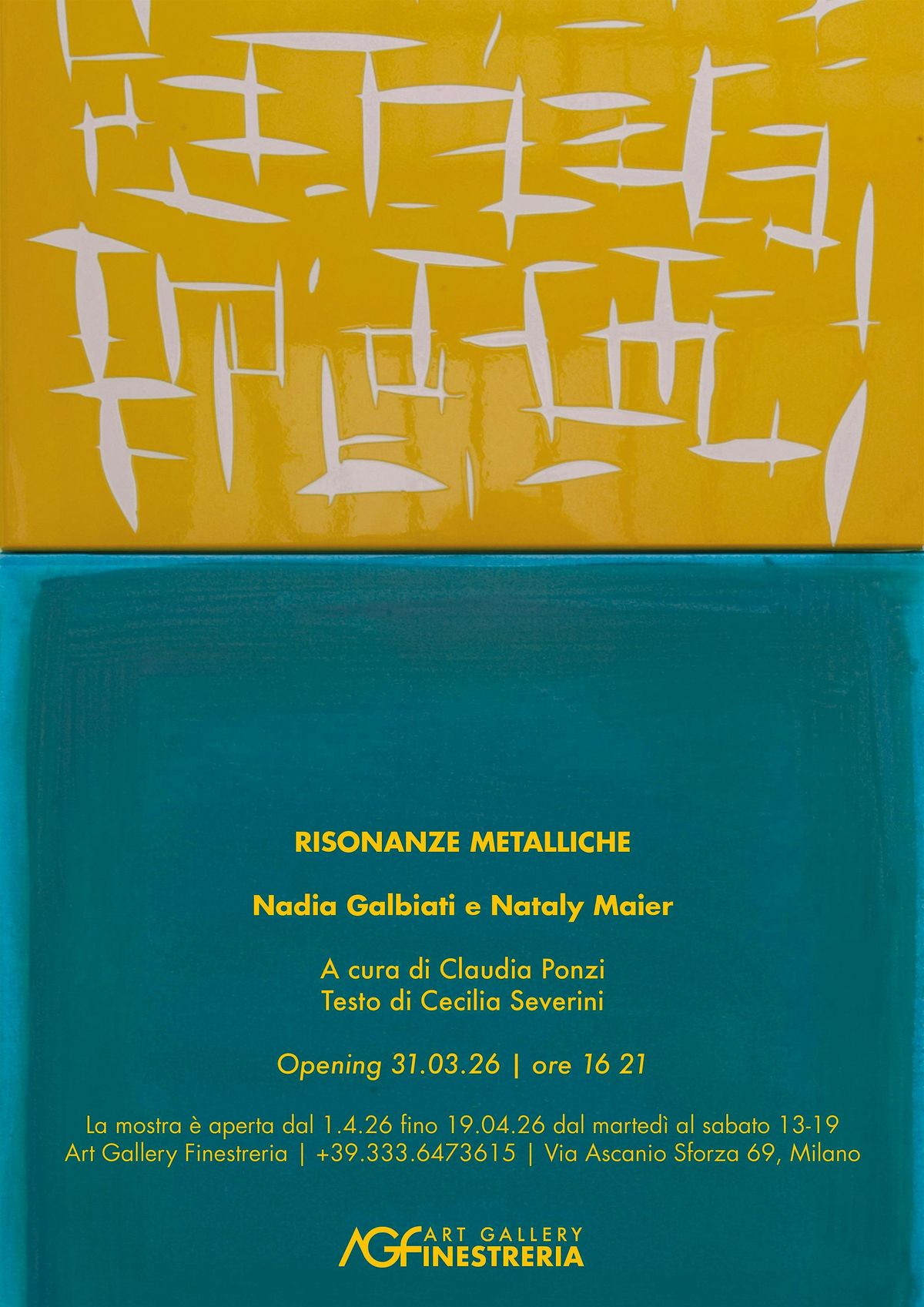 Risonanze metalliche riunisce due forze poetiche distinte e al tempo stesso complementari. Nadia Galbiati (Cernusco sul Naviglio, 1975), artista dal solido percorso lavorativo, indaga lo spazio urbano, il vuoto e la forma che lo definiscono attraverso sculture fondate sulla geometria e sul dialogo con il luogo circostante. Nataly Maier (Monaco di Baviera, 1957), artista dalla carriera ricca e multiforme, con numerose mostre nazionali e internazionali alle spalle, attraverso un approccio filosofico e la sperimentazione di numerosi materiali, esplora il colore e la percezione dell’esperienza fenomenica in contrapposizione con l’astrazione.