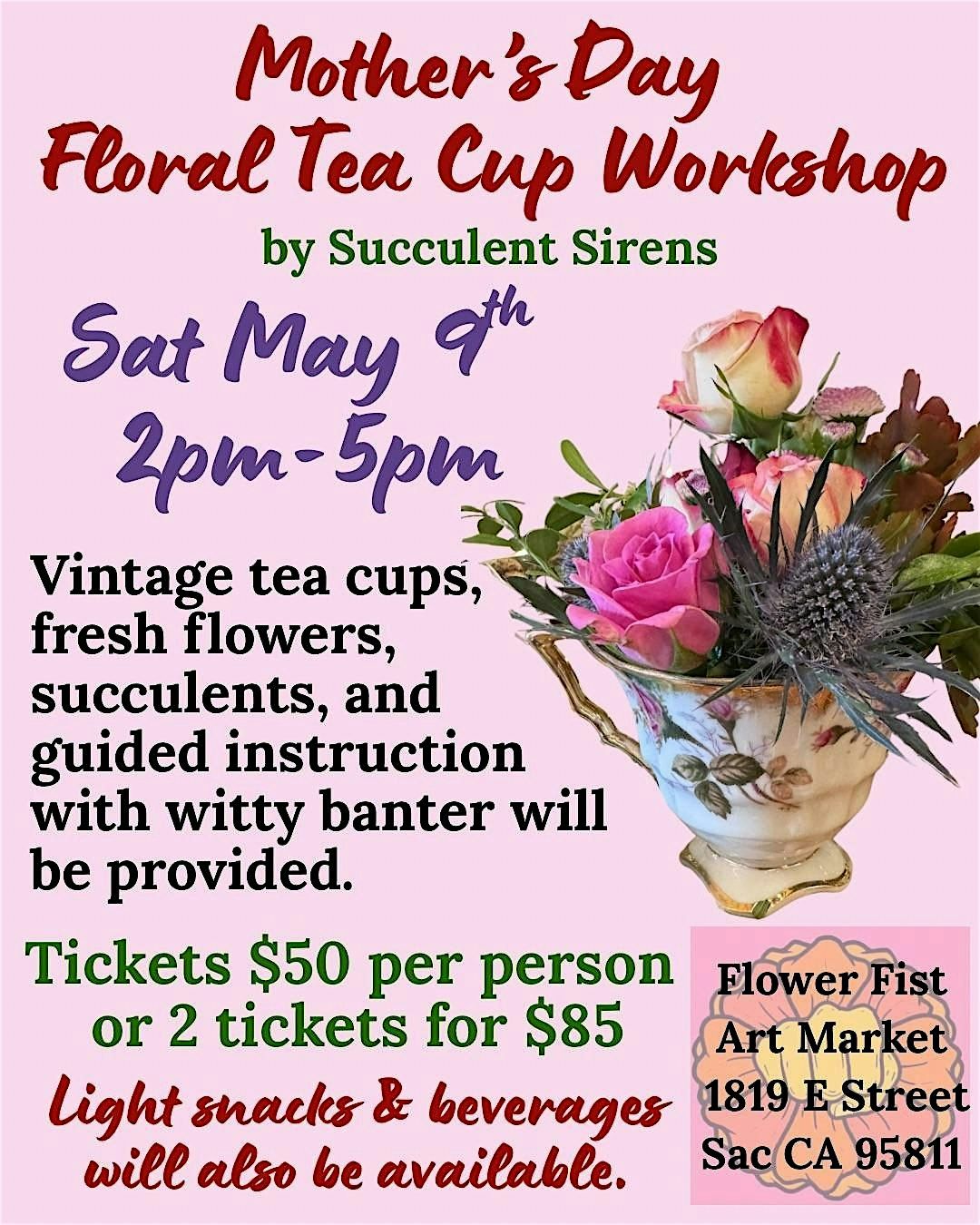 Our workshop attendees will receive their own vintage tea cup and saucer to keep, modified with a permanent floral pin frog. We will provide fresh flowers as well as snacks and beverages.
