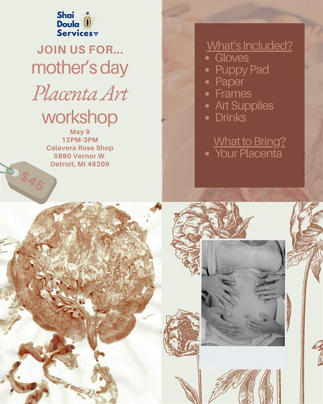 Join Shai Doula Services for our Mother’s Day Placenta Art Workshop, a beautiful and empowering experience for new and expecting mothers. In this intimate 3-hour workshop, you’ll learn how to create a stunning keepsake print using your placenta — a practice that honors the incredible organ that nourished your baby.