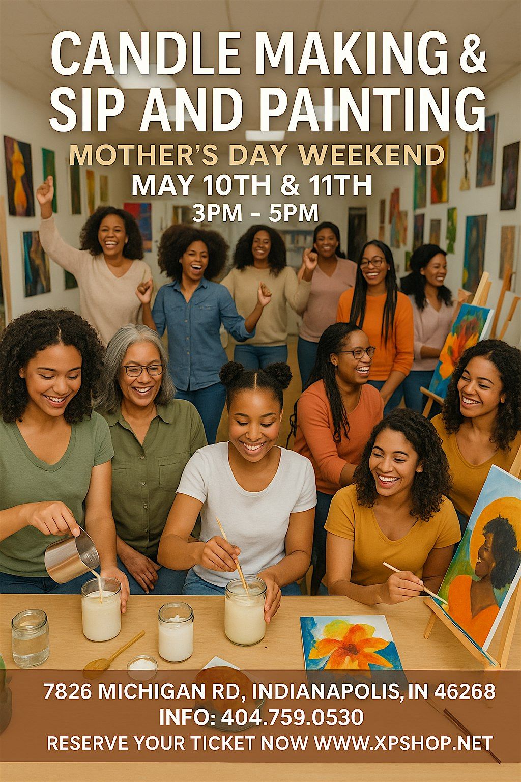 Join us at PHIRI ART GALLERY on May 8, 2026 at 1:00 PM (Eastern Time) for a fun and creative afternoon! You’ll get to make your own candles and enjoy a chill sip & paint session. Perfect way to celebrate Mother’s Day weekend with friends or family. No experience needed—just bring your good vibes and get ready to create!