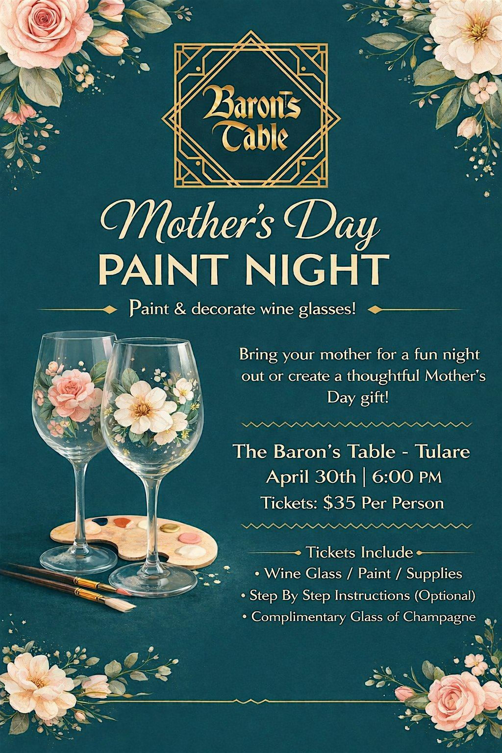 Celebrate Mother’s Day with a creative night out at Baron’s Table in Tulare! Join us on April 30th at 6:00 PM for a relaxing and fun Paint Night where you’ll design and decorate your own set of wine glasses.