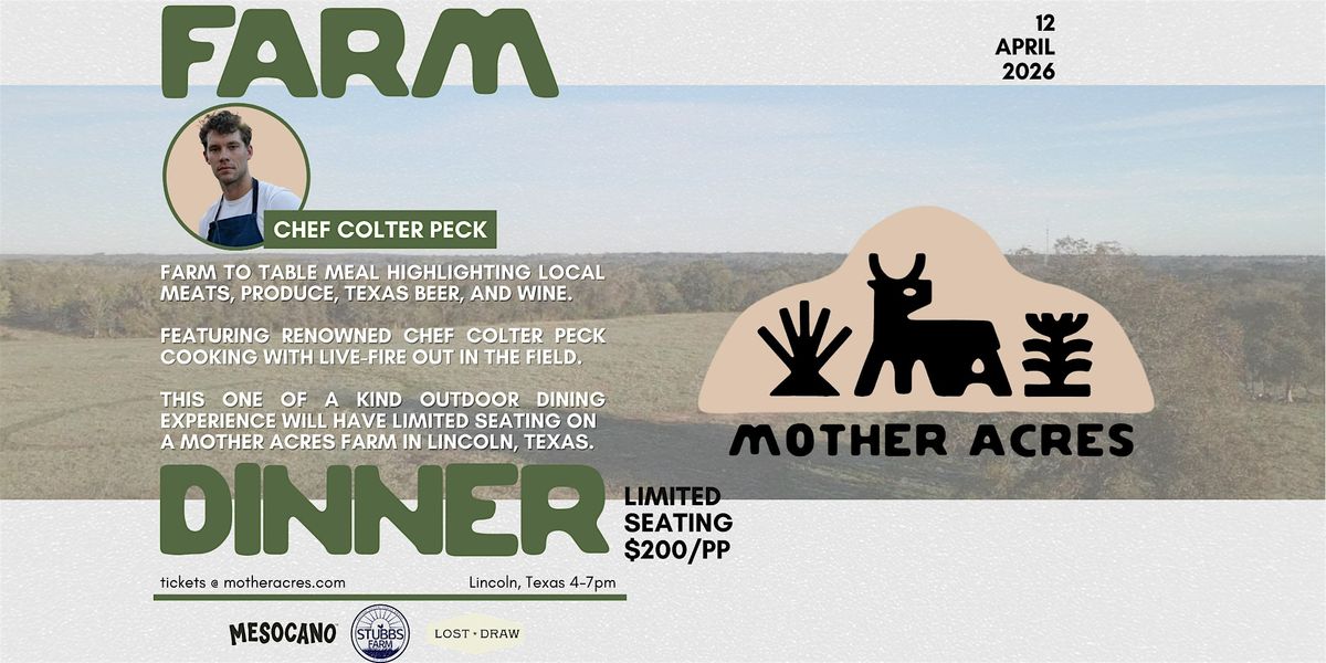 Join Mother Acres and renowned live-fire chef Colter Peck for a spring farm-to-table dinner located in one of the fields that we raise our animals in. This dinner will be rooted in faith, community, and Texas land stewardship.