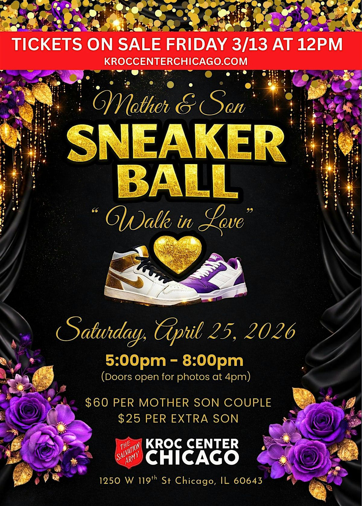 Join us on April 25, 2026 - 5 - 8pm for our 4th annual Mother Son Sneaker Ball that’s open to all mothers and their sons of all ages. This event features a fun evening of dancing, interactive games, food and great music. Dress attire is semi-formal to formal WITH SNEAKERS! Come make a great magical family memory! Space is limited and the event is likely to sell out. This years event will be held in our Kroc Banquet Theater
