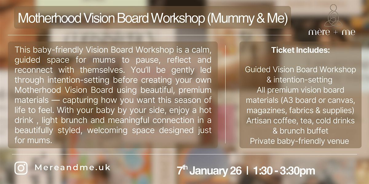 This is a gentle, guided Vision Board Workshop for mums — not a high-pressure goal-setting session. With your baby by your side, you’ll begin with a short intention-setting talk designed to help you reflect on this chapter of motherhood, release comparison and clarify what you want more of (rest, confidence, connection and balance).