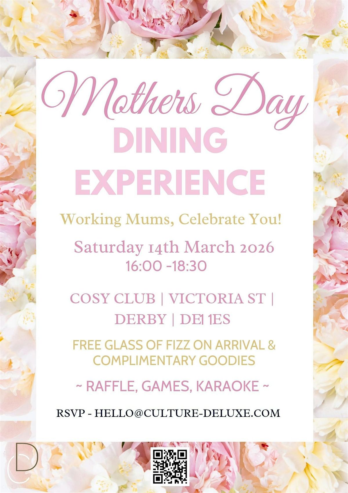 Taking place at the stylish Cosy Club in Derby, guests will be welcomed with a complimentary glass of fizz on arrival, setting the tone for a wonderful afternoon of celebration.
