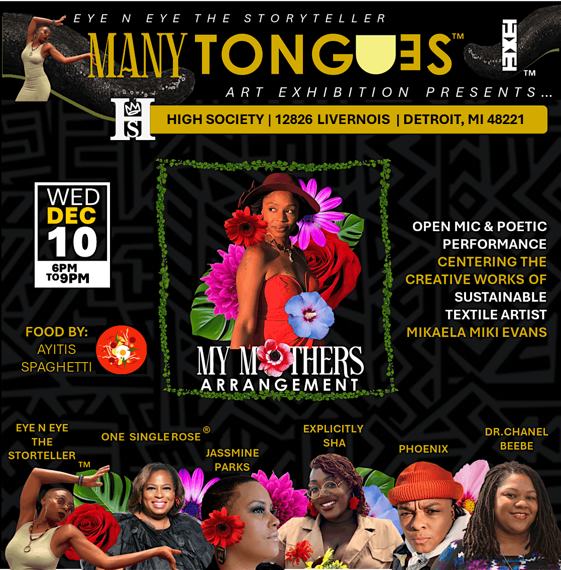 The Many Tongues™ Exhibition continues with My Mother’s Arrangement, a night of poetry and truth-telling that holds both the ache and the tenderness of womanhood and becoming. Curated and performed by Brittini Ward of Eye N Eye LLC, this intimate evening invites guests into a poetic dialogue about the women who shaped us — the beauty, the burden, and the in-between.