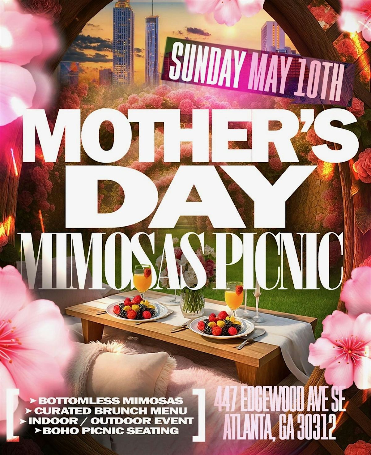CELEBRATE ALL THE MOTHER FIGURES IN YOUR LIFE WITH A BOTTOMLESS MIMOSAS PICNIC EXPERIENCE. OUTDOORS WILL BE TRANSFORMED INTO AN ALL WHITE AND PINK BOHO STYLE AFFAIR . WE ARE SO EXCITED TO HOST YOU AND LOVED ONES ON THIS SPECIAL DAY.