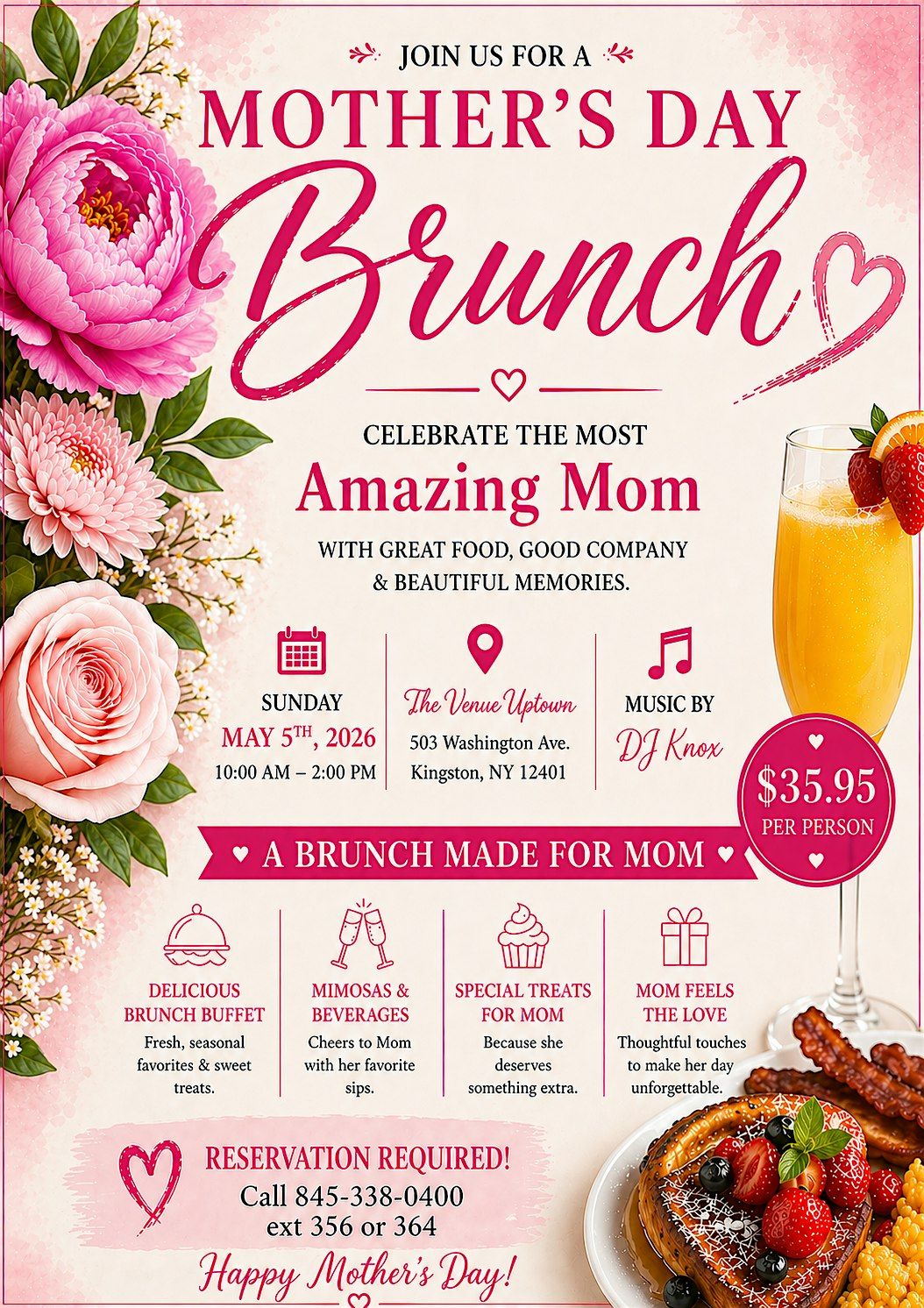 Come celebrate Mother's Day with us in person! Enjoy a relaxed and cozy atmosphere filled with delicious food, great company, and lots of love. It’s the perfect way to show mom she’s appreciated and pampered. Bring your family and share some smiles, laughs, and tasty bites together. We can't wait to see you there! Music provided by DJ Knox.