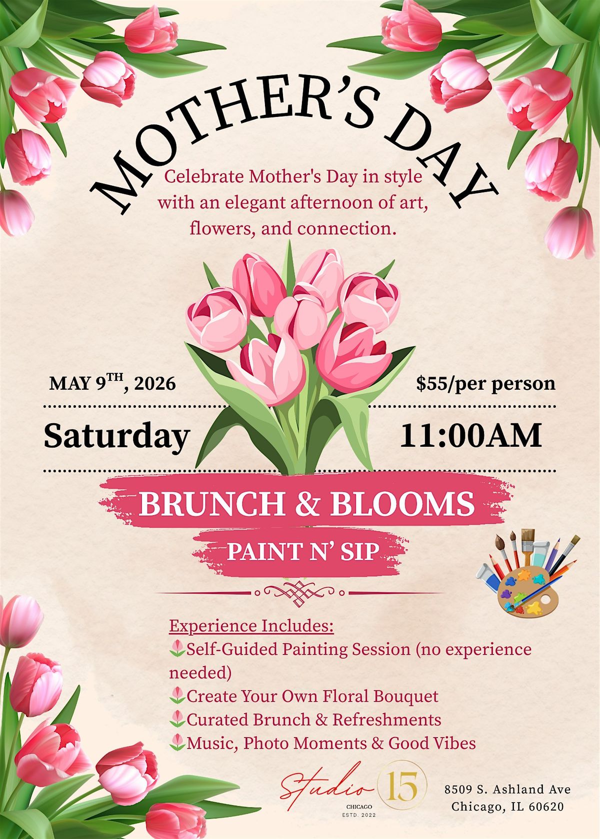 Celebrate Mother’s Day in style with an elegant afternoon of art, flowers, and connection at @studio15chicago!
